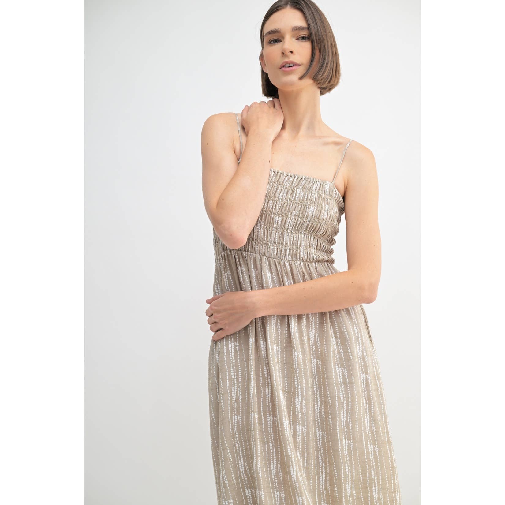 ABSTRACT PRINT SMOCKING DETAIL MIDI DRESS