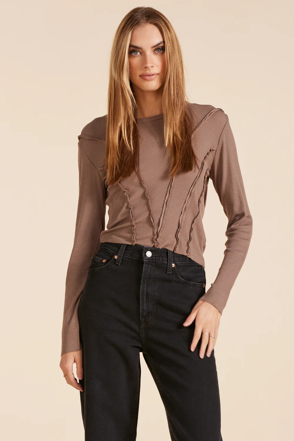 Reverse seam details accent this modal spandex rib long sleeve tee. In this season's must-have neutral hue, this standout style is finished with an asymmetrical hem for added interest.