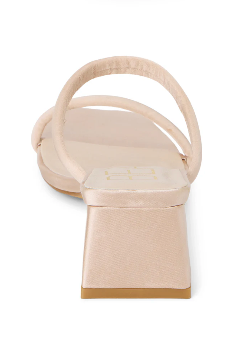 Vegan two-band sandal on slender block heel.