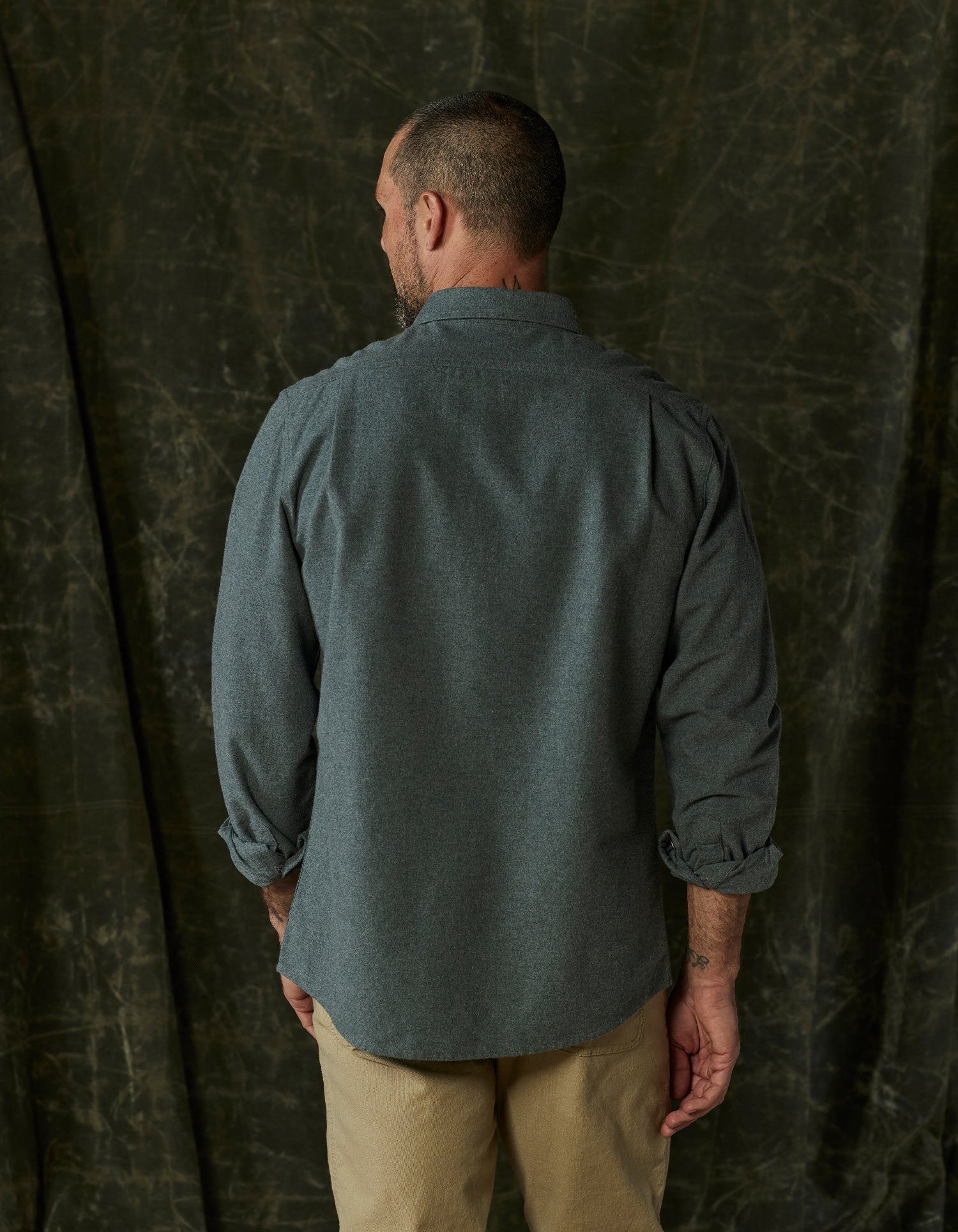 2-ply collar and collar stand. Adjustable sleeve cuffs. Chest pocket on wearer's left. Double needle flat felledd seams at armhole, side seams, and sleeve seams. Shirttailhem. Novelty painted metal engraved buttons. Damask bear tag at under placket. Signature back neck tape.