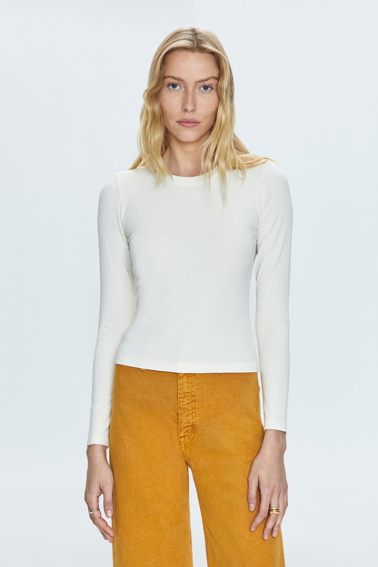Fitted lightweight rib knit tee with an elevated, wardrobe essential sensibility. Designed with a crewneck, long sleeves, and a hem length that grazes the waistband for a sleek silhouette.