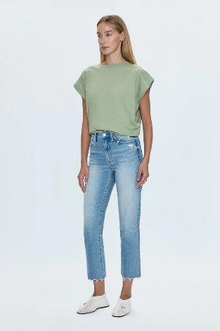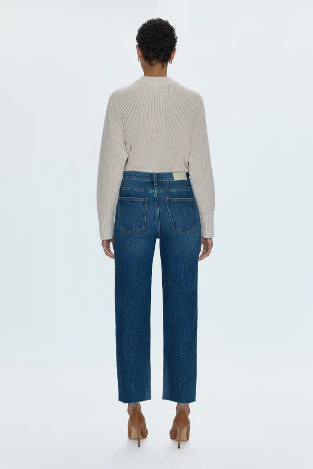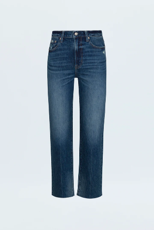 The perfect getaway. A high rise, figure hugging waist that falls to a straight leg silhouette with a cropped, scissor cut hem. Crafted from rigid, non-stretch denim for an expert fit that holds its shape