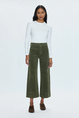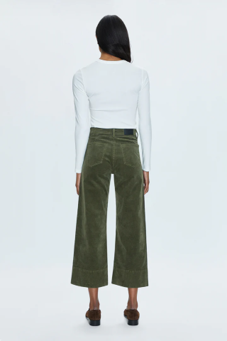 High rise waist, with a wide leg silhouette and a cropped, ankle length hemline. Crafted from a soft textured corduroy fabrication with our signature comfort stretch denim. Finished with a double stitched waistline and wide cuffed hems. Martini is a warm, deep olive green colorway with a subtle sheen.