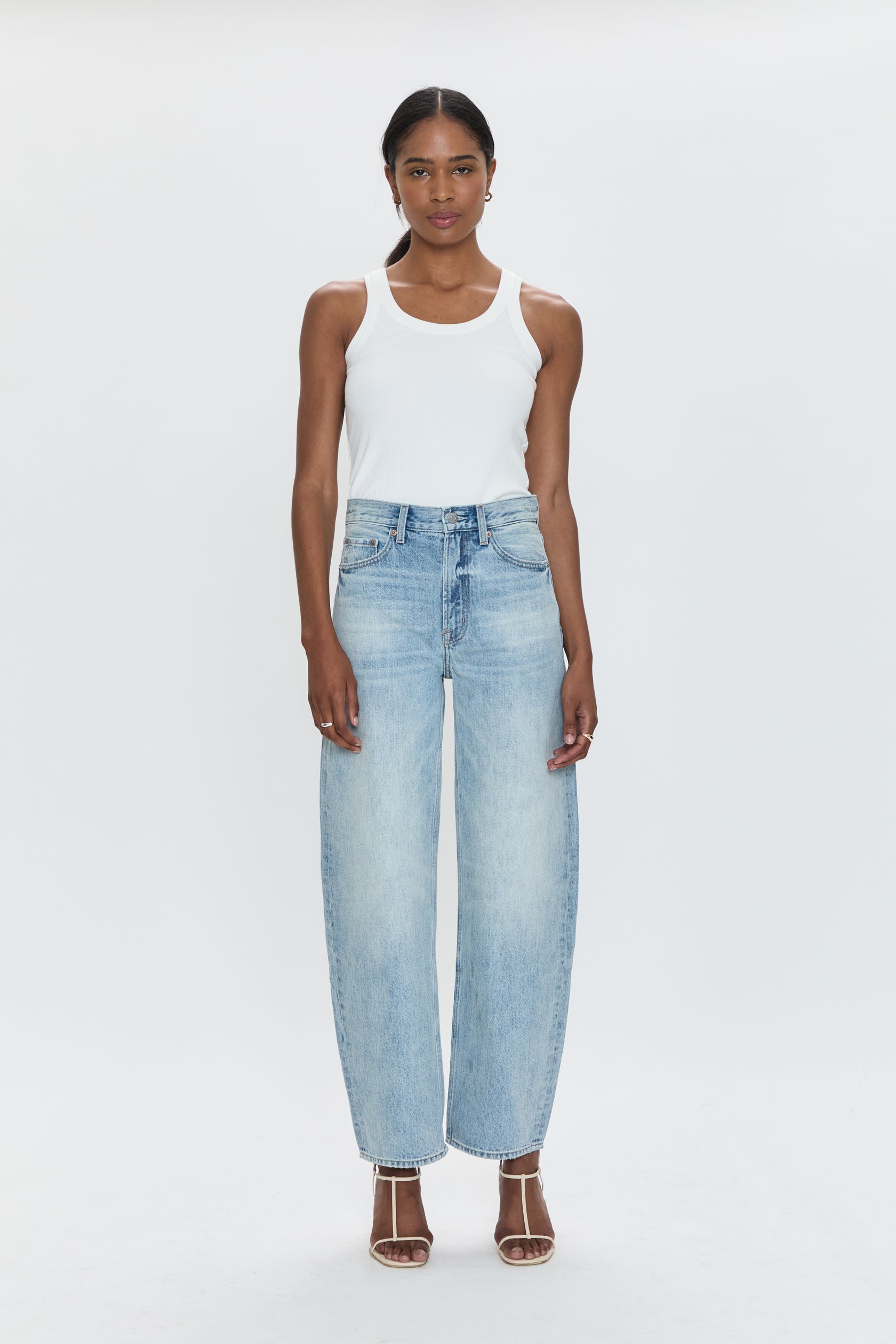 High rise waist with a full length 30" inseam and a barrel leg silhouette. Crafted from rigid non-stretch denim for an expert fit that holds its shape, with clean hem finishes. Clever is a vintage inspired light wash with moderate fading.
